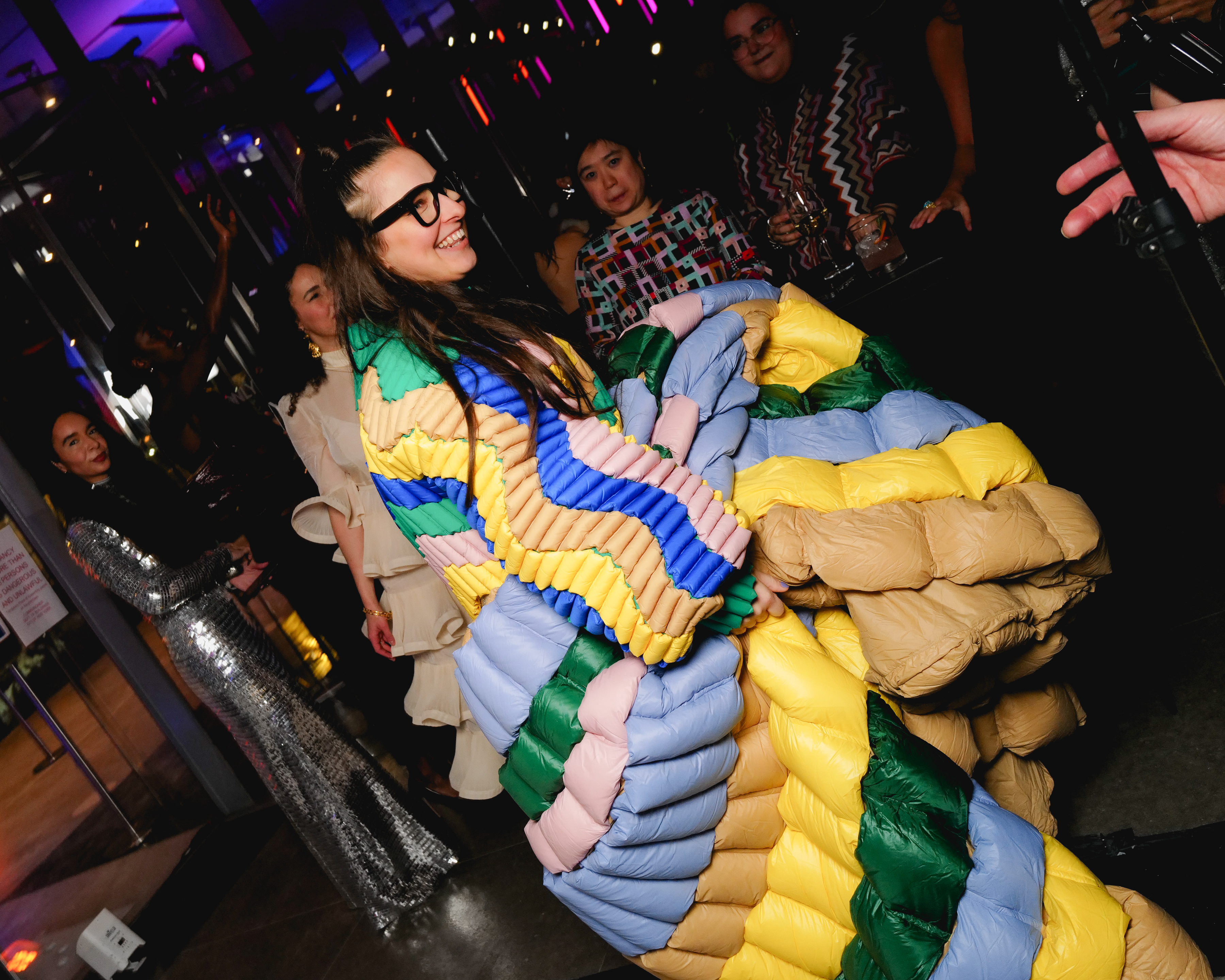 The Dare goes on and everyone rushes the dance floor: art world It Girl Molly Krause (in a puffy, multicolor Christopher Raxxy dress), Ally Shapiro, Leo Braudy, Ernie Poma, Jake Rosenblüth, Logan Horne, Casey Kohlberg and Polina Proshkina. The scene is a swirly sea of New York socials in colors, patterns and sparkles.