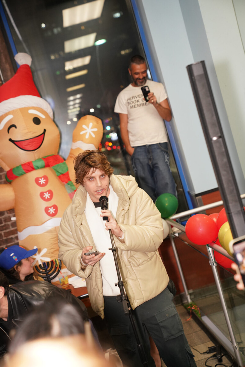 “Where is Lukas Gage?” Maren Frey, who wears Chanel ballet flats and is a student at Barnard, asks me anxiously. Maren’s dad, A Million Little Pieces author James Frey is one of the headliners, but she is antsy to meet movie star Gage, who still hasn’t appeared. By the waving gingerbread man, “Girls” star Jemima Kirke shares excerpts from her sex advice column (why not bonk your boss she reasons) and poetry. Rob Franklin who wrote Great Black Hope, Interview Editor in Chief Mel Ottenberg and Cat Cohen all do readings. Then, up the stairs comes Gage with what looks like dried blood around his mouth. He squeezes through the crowd and Starr hands him a mic. “Everyone is giving me really worried looks,” the actor says. “My face is OK. I just ate pussy for the first time in five years.” The crowd claps, then Gage adds, “Nah, I just died tonight for my movie. Spoiler alert.” Before he leaves, Gage mentions that someone, somewhere at Burger King has copies of his memoir I Wrote This for Attention for sale.
