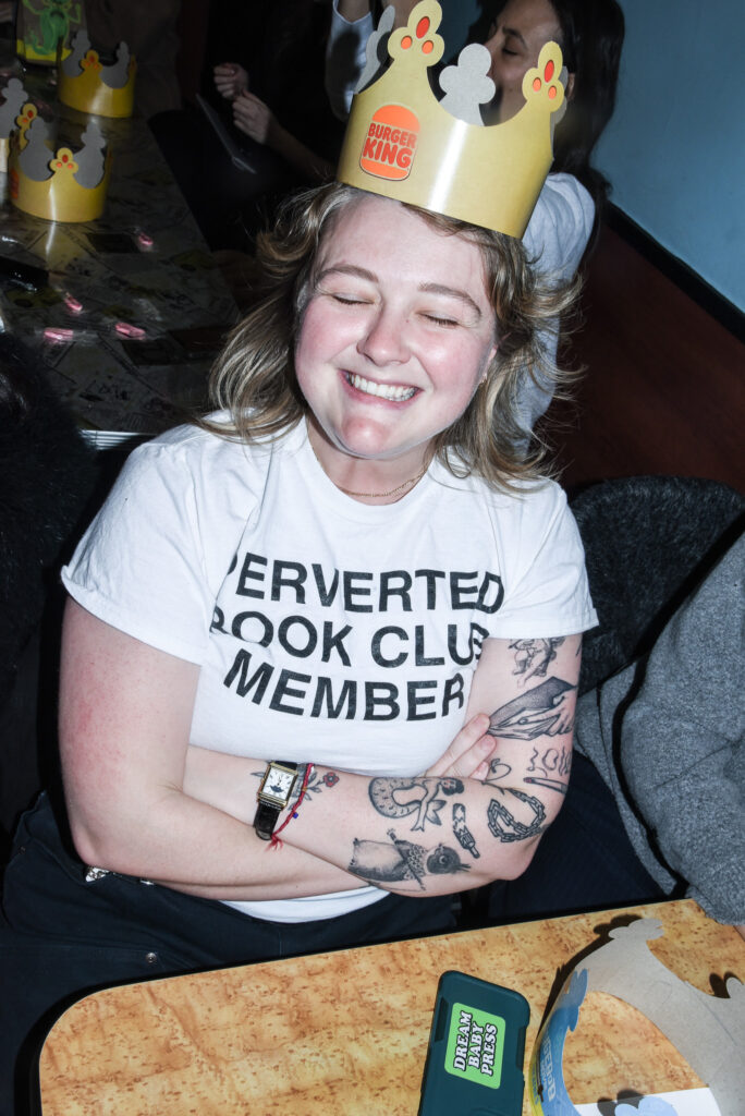 Things are a bit behind schedule. It seems Lukas Gage, the breakout star of “White Lotus” – who got married by Kim Kardashian to her hairdresser Chris Appleton on reality TV (the couple divorced months later) – is running late. I spot the fainting girl chomping on a Whopper. “It’s like Vaudeville,” Starr explains. “We have two simple rules. You can’t read off your phone. I find it insulting to the audience. And it has to be fun and exciting. It doesn’t have to be crazy and perverted. When you are in a room of 400 people in fluorescent lighting and you read horny things, it stops being horny and it becomes very funny.” The Perverted Book Club has done a love letter themed collaboration with Valentino and opened for a Broadway play. There are hundreds on the wait list for tonight (events are announced on Dream Baby Press’ Instagram). Starr insists he is keeping it all indie. “I want to keep doing them at Burger King. It’s become our headquarters,” he says. “But I don’t like turning people away. Can I find a venue that has 800 people, but also still has that New York specialness?”