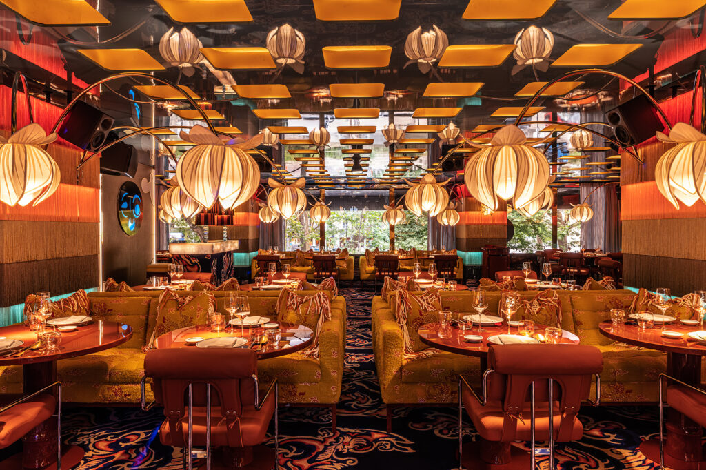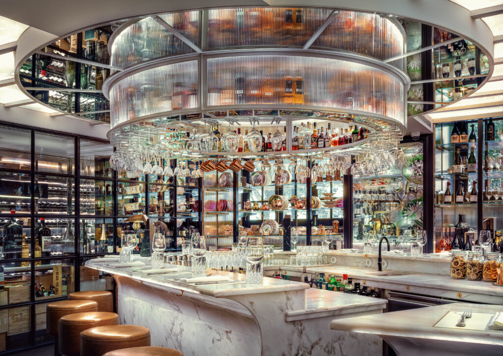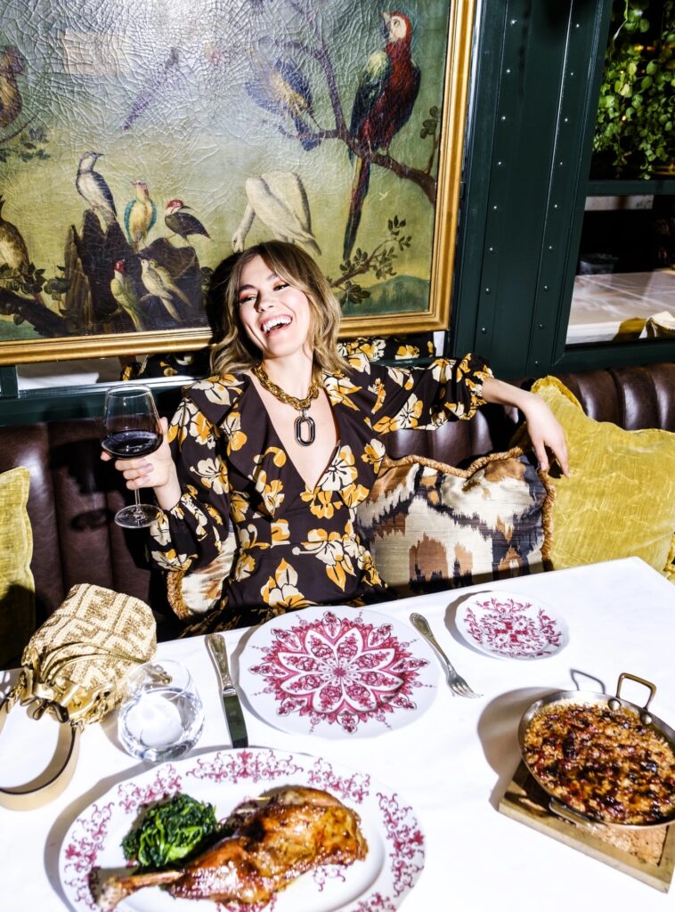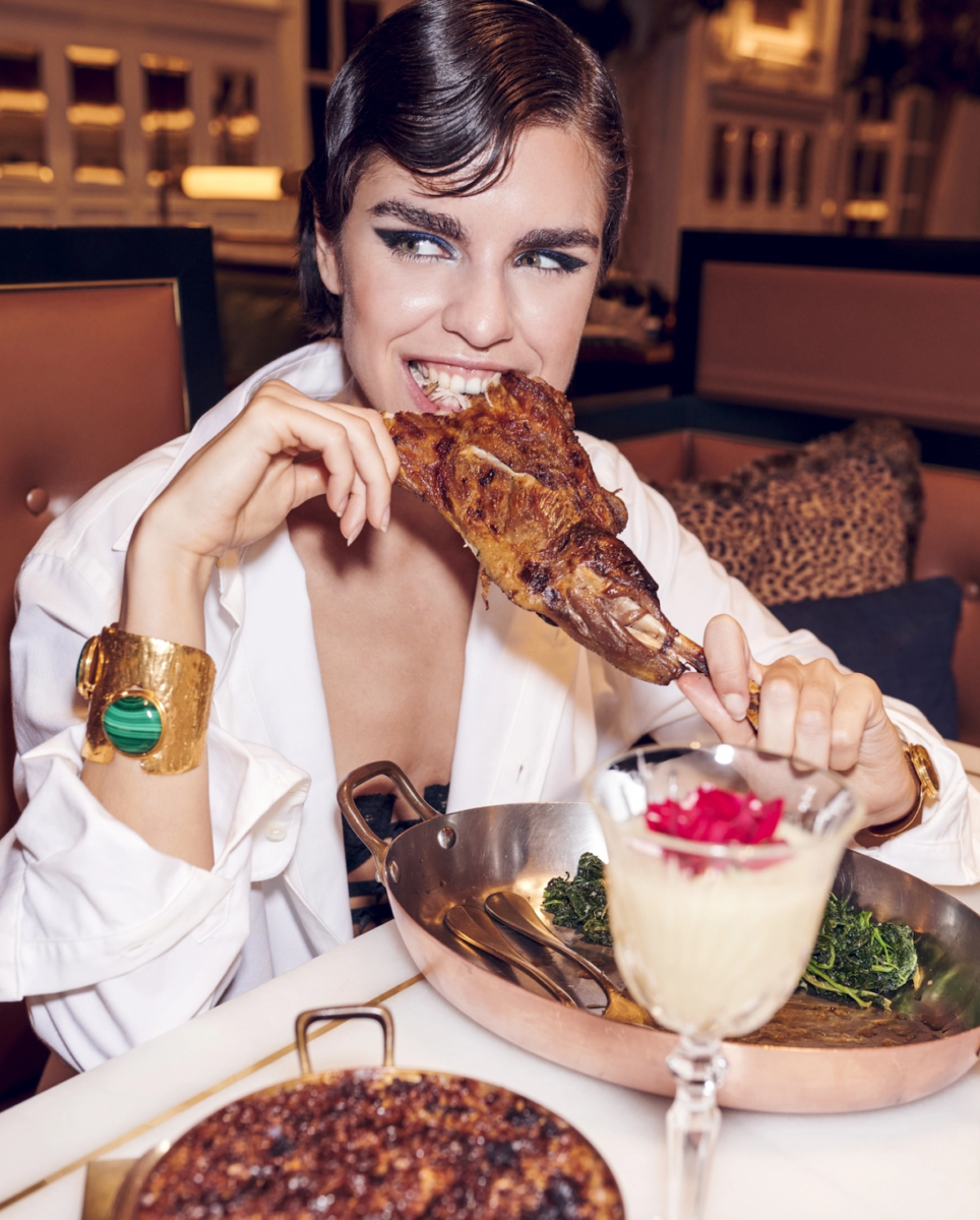Each JNçQUOI restaurant offers an entirely different vibe and cuisine. Avenida, a former theater, has soaring ceilings and a life-size velociraptor skeleton in a glass box. You might find club members Berkus and husband Jeremiah Brent lingering with their kids. “We love a long lunch with our children,” Berkus says. “And a private party at night.” At Avenida, I savor prawns and lobster draped in truffle mayonnaise piled so high with beluga caviar that it makes my jet-lagged head spin. Downstairs, the bar room is a glass-walled wine cage, part private tasting, part dinner theater. In a move of disco decadence, the black glitter terrazzo bathroom in the basement has stalls that circle a DJ booth like a surreal nightclub which it becomes at night.