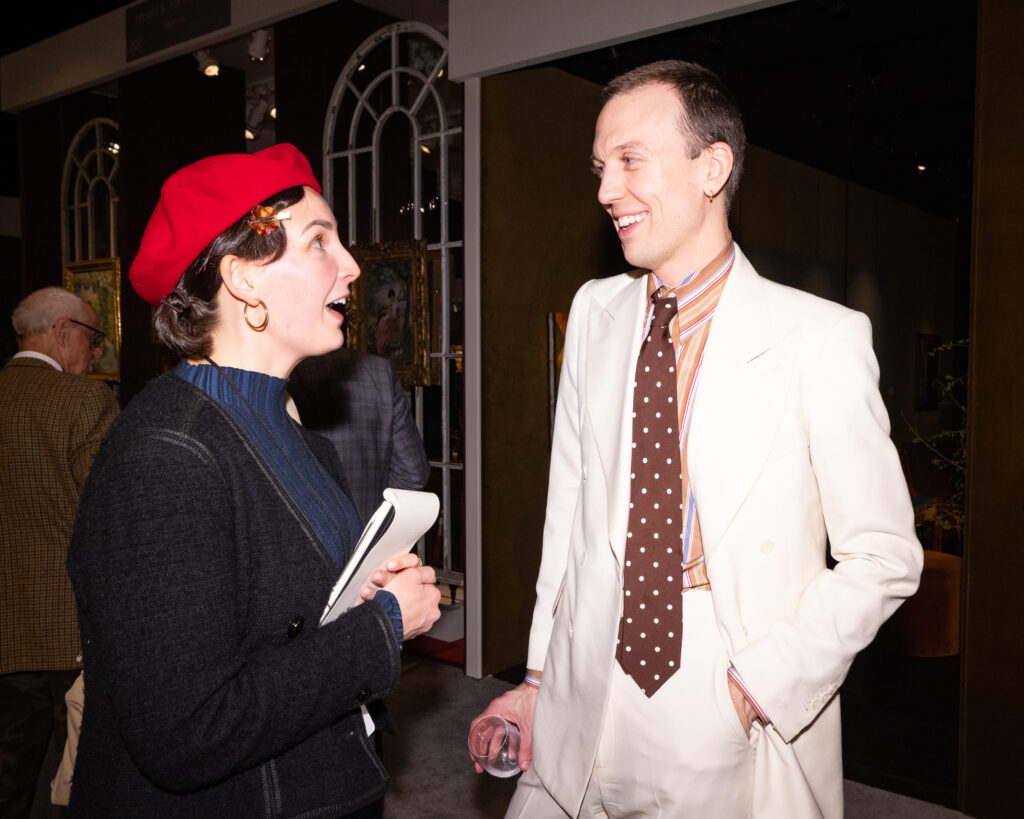 Antique dealer Ben L. Miller is part of “Study of a Young Collector,” one of the night’s biggest draws. A luxe little booth evokes the private study of an imaginary emerging client – the debut showcase was hand-curated by art advisor and writer Patrick Monahan with Helen Allen. Miller, host of Antiques magazine’s wildly popular podcast Curious Objects and founder of his eponymous gallery, is hoping to make a mark among the stalwarts. “Even as a relatively unknown business there’s a certain level of seriousness in conversations beyond what I’m used to,” Miller confesses. “Customers know where the buck stops and ultimately, it’s with the owner. Now the potential stakes are all on me. Still, if I went through the whole fair without selling, it’s worth it. This is essentially my coming out party.”
