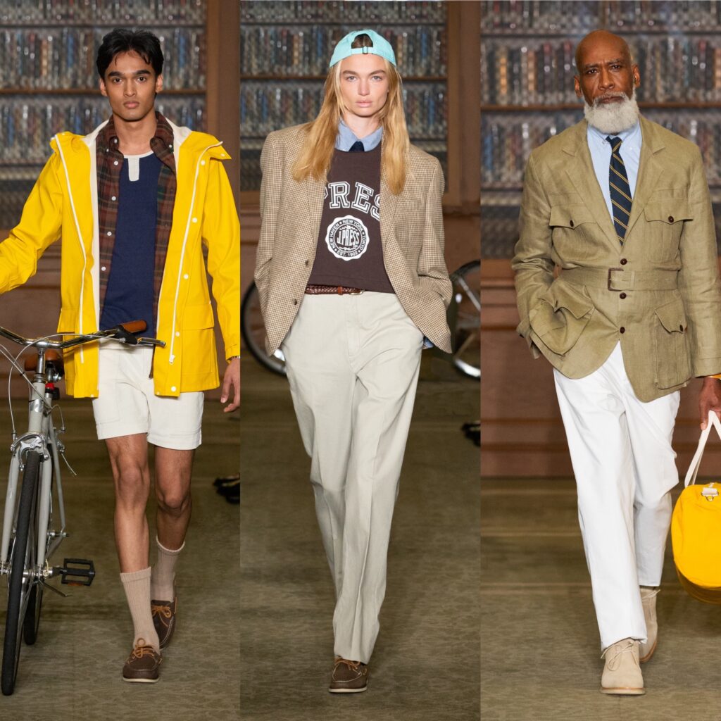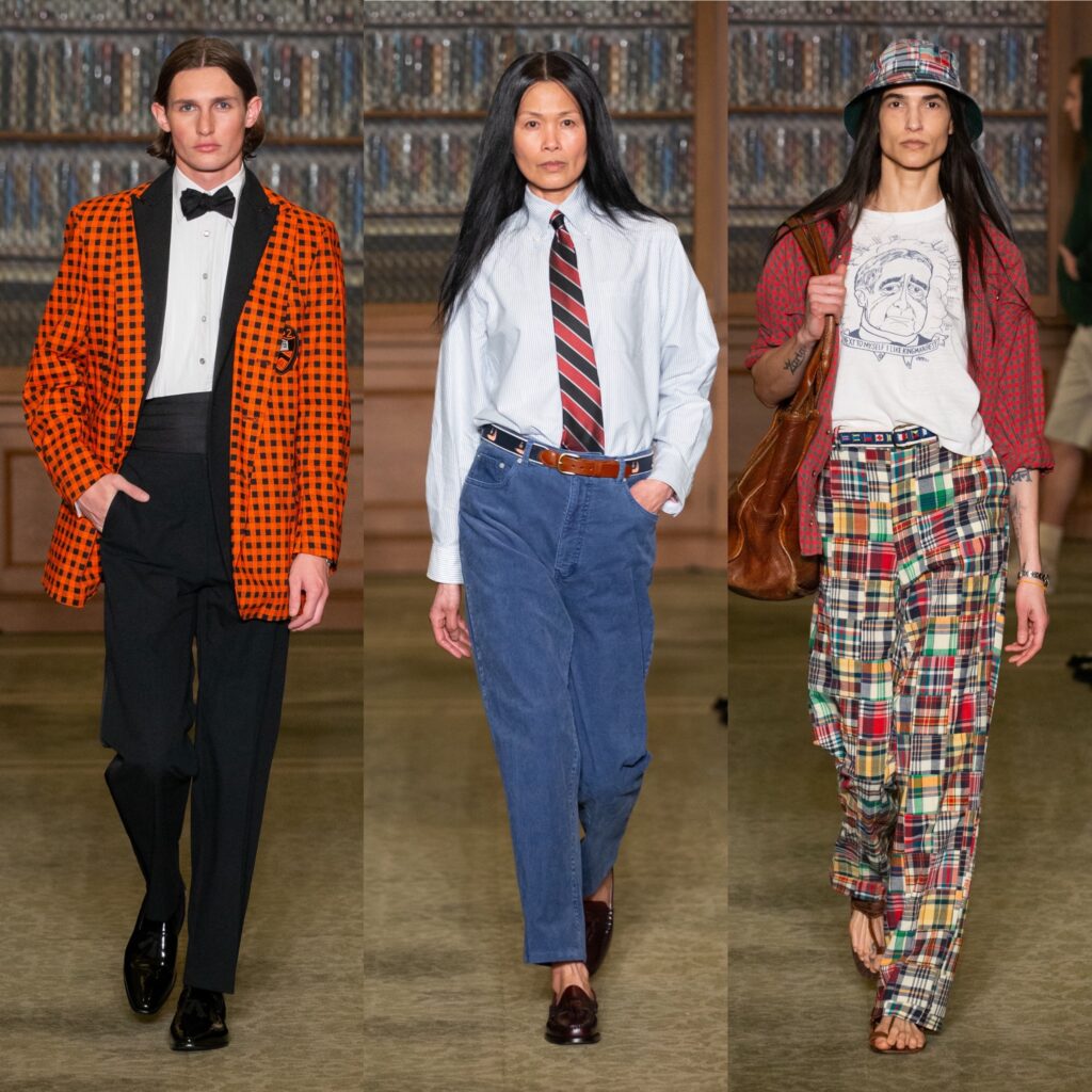 Simon & Garfunkel’s “The Sound of Silence” echoes through the storied halls at the New York Historical Society for the J. Press show – a theatrical stroll down the patrician, ivy-lined path of American prep. The show pays homage to Take Ivy, the cult chronicle of Ivy League style, written in 1965 by four Japanese menswear addicts. Creative Director Jack Carlson (who founded the label Rowing Blazers) has models with bicycles and books in letterman jackets, rep ties and straight-legged khakis that break neatly over loafers. There are great slouchy patchwork madras pants, women in men’s suits carrying briefcases and a navy scoop-neck sweater that reads: “TAKE IVY” in bright orange varsity style letters. If you grew up with Lisa Birnbach’s lifestyle bible The Preppie Handbook, this is your jam. Carlson intimately knows the rarefied world of the “true prep.” It doesn’t get more authentic than this.