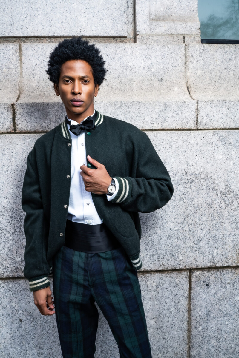 Simon & Garfunkel’s “The Sound of Silence” echoes through the storied halls at the New York Historical Society for the J. Press show – a theatrical stroll down the patrician, ivy-lined path of American prep. The show pays homage to Take Ivy, the cult chronicle of Ivy League style, written in 1965 by four Japanese menswear addicts. Creative Director Jack Carlson (who founded the label Rowing Blazers) has models with bicycles and books in letterman jackets, rep ties and straight-legged khakis that break neatly over loafers. There are great slouchy patchwork madras pants, women in men’s suits carrying briefcases and a navy scoop-neck sweater that reads: “TAKE IVY” in bright orange varsity style letters. If you grew up with Lisa Birnbach’s lifestyle bible The Preppie Handbook, this is your jam. Carlson intimately knows the rarefied world of the “true prep.” It doesn’t get more authentic than this.